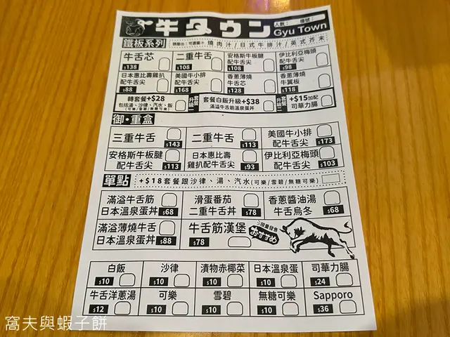 看看餐牌,食物分三大類,分別是鐵板系列、御.重盒和單點,單點類有丼飯、烏冬和漢堡。