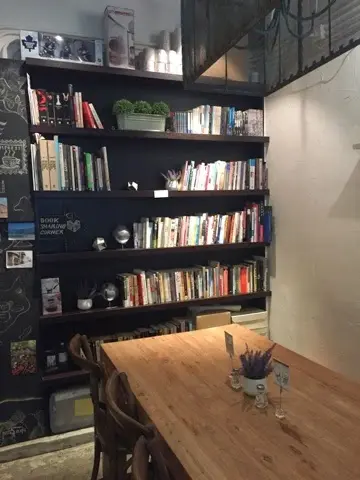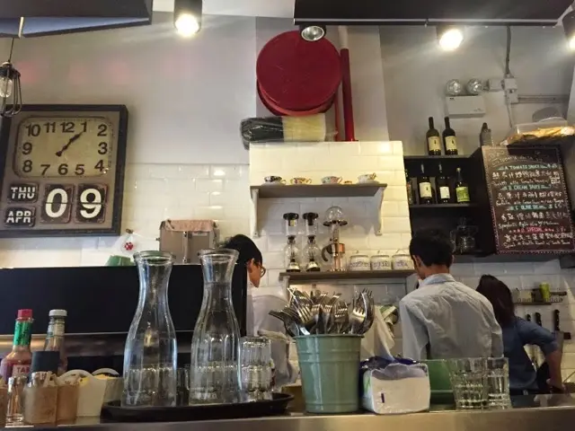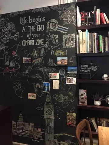店舖面積不大,是開放式廚房,只有1張6人枱、2 張4人枱及數個bar枱座位,店子充滿舒適寫意的氣氛,播放著輕鬆的音樂,牆上擺放了幾幅畫,而最吸引的就是靠向書櫃的6人枱,那個Book Sharing Corner頓時令整間店的文化氣息提升,而且在旁邊的粉筆畫也非常討好,特別喜歡那句Life begins AT THE END of your COMFORT ZONE,有很深的意思,非常敬佩那些到外地工作假期的朋友,勇於暫時放棄工作及家人到外地闖闖及體驗,真正離開自己的COMFORT ZONE。