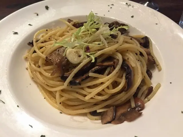 食物選擇有4款,3個意粉及1個精選(意式芝士菠菜雲吞),我點了香草欖油雜菌意大利粉,味道相當不錯,而且那些雜菌非常鹹香,而咖啡的拉花也非常精緻,同事也讚味道好,加$25可連沙律及飲品。
