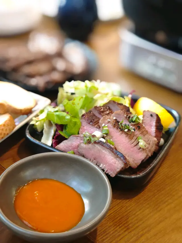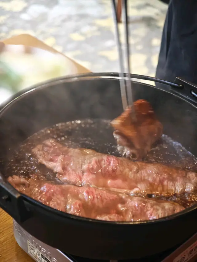 有職員幫手燒,用海鹽同牛油熱個左鍋之後加埋D壽喜燒汁放牛入去燒,牛頸脊好濃牛味,油感唔多。另外之後食埋片和牛,好嫩好滑,入口就溶左咁,好食。