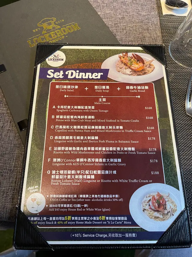 今餐我就叫左澳洲O’Connor 草飼牛西冷蒜香意大利扁麵、香煎深海石斑魚柳拼日本北海道刺身級帶子配意式蕃茄莎莎,仲叫埋咸蛋黃薯角同疏乎里蛋糕。