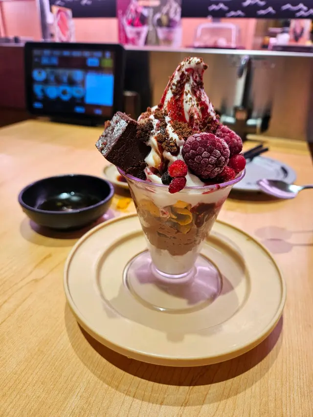 朱古力芭菲杯賣相又靚,味道亦唔錯,最上層係軟雪糕,上面鋪咗士多啤梨醬同埋朱古力味脆脆,上面仲有粒brownie同埋紅莓,中間嗰層係早餐粟米片,再落一層係朱古力moouse,最底有少少cream