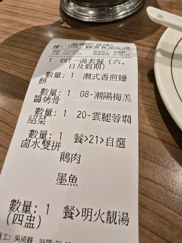 食火鍋?定潮州菜? lovelypink等级42024-12-314K 浏览 关注 四餸一湯套餐(六, 日及假期)潮式香煎蠔餅可能食慣左少少脆口的個款呢款吾脆總覺得怪怪地108-潮陽梅羔醬烤骨估吾到梅羔醬係甜甜地我諗的係酸酸地的開胃菜1雲腿蓉燜紹菜菜燜到好好食餐>21>自選鹵水雙拼鵝肉墨魚片餐>明火靚湯(四盅)呢個湯到我地差吾多清晒餸叫服務員跟左2次單都未上不過好好飲無味精2以上食记乃用户个人意见 , 并不代表OpenRice之观点。赞好分享食火鍋?定潮州菜? 潮潮居 https://s.openrice.com/QrLT0OZXP00检举 张贴 评分4味道4环境2服务4卫生3抵食用餐日期2024-12-29用餐途径堂食