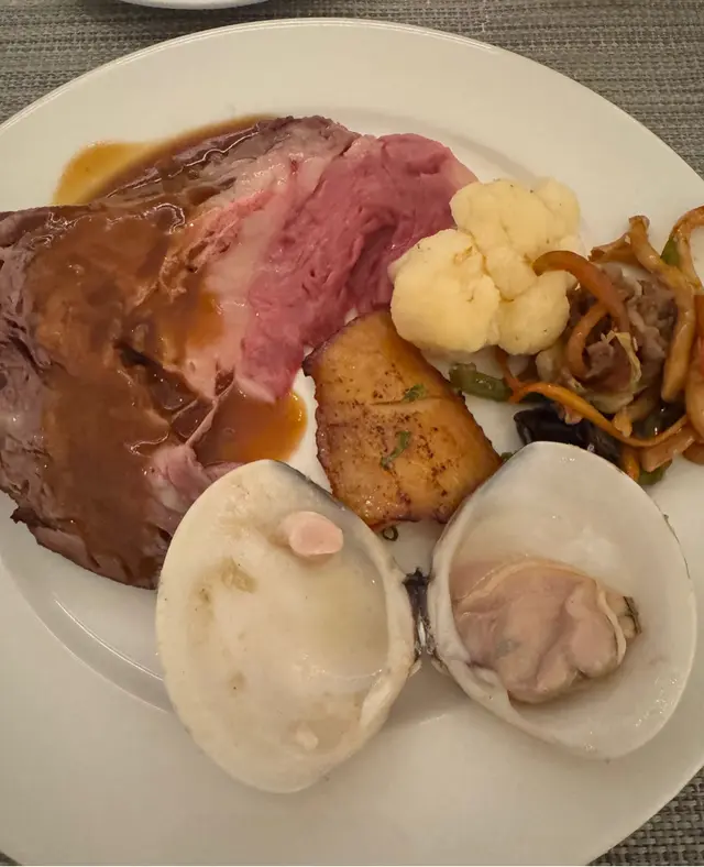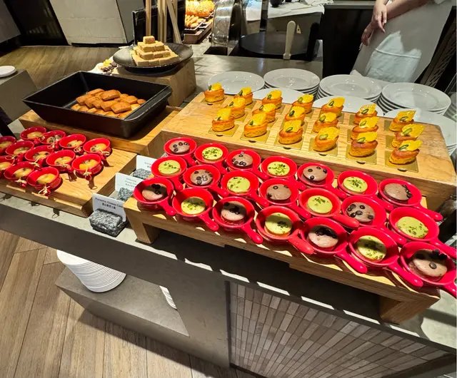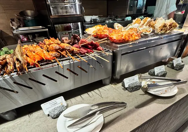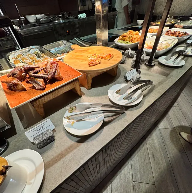 食物選擇豐富,有冷海鮮(長腳蟹、龍蝦、蟹鉗、蝦、青口、小龍蝦、煙三文魚)、刺身、壽司。有日式串燒(蝦、秋葵、牛肉、多春魚)、燒蠔、燒龍蝦、螺肉。中式熱葷包括鮑魚鵝掌、蒸石斑、燒乳鴿、炸蠔、蜜豆蝦仁、炒飯、炒菜。西式有即煎羊架、鵝肝、煎牛扒、即切肉眼、西班牙乳豬焗飯。另外有印度咖哩、即煮粉麵、燉湯。甜品方面,有楊枝甘露、焦糖燉蛋、各類迷你布丁、蛋糕仔,亦有即造梳乎厘及朱古力心太軟。