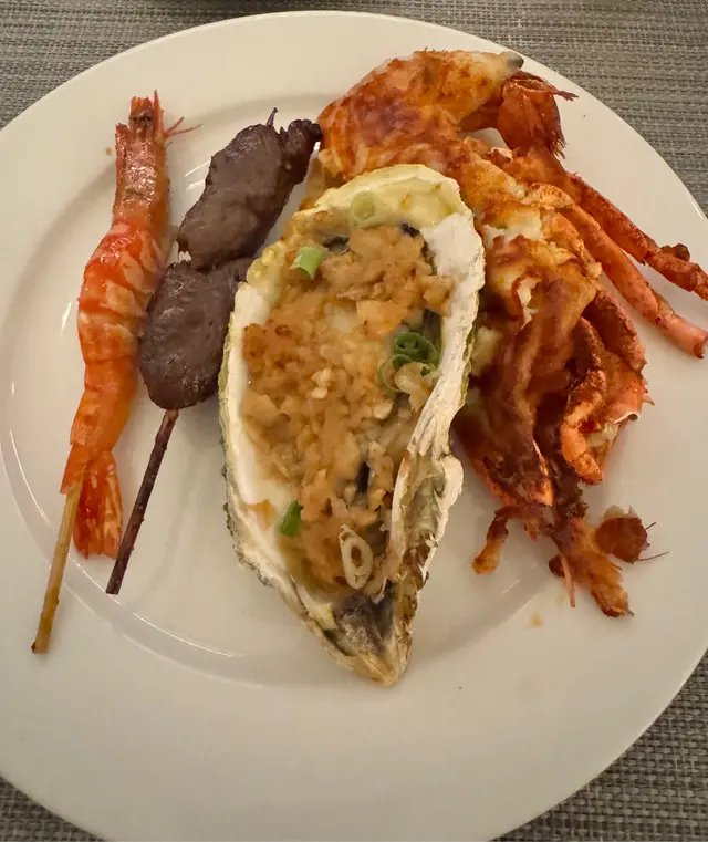 芝士焗龍蝦肉質彈牙,芝士汁入味。焗蠔鮮甜濕潤,燒牛肉串腍身肉汁香濃,串燒蝦爽口鮮甜。