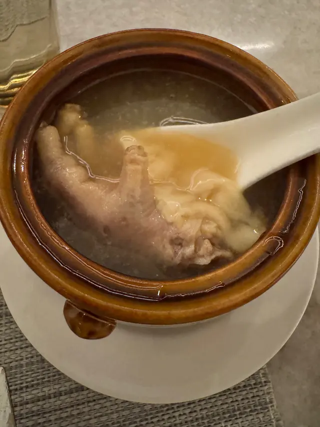花膠雞腳燉湯用料豐富,有一條花膠及一隻雞腳,花膠軟滑、骨膠原充足,雞腳腍身,雞湯清醇。