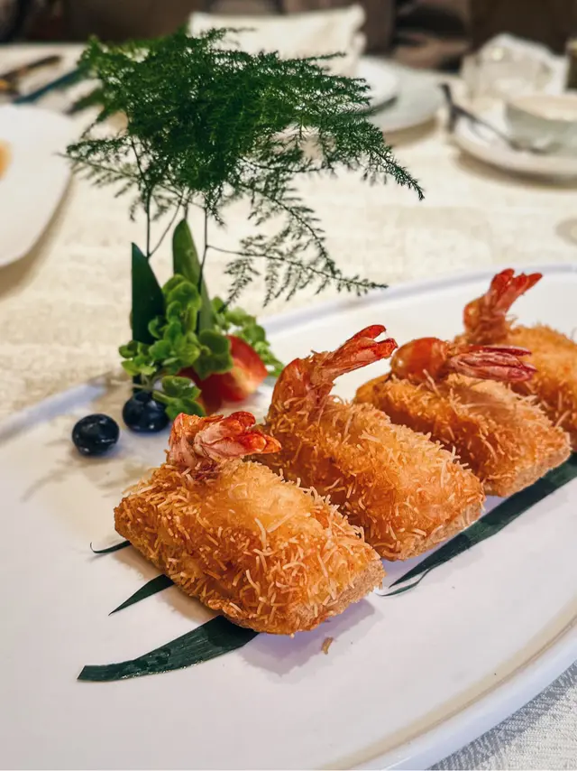 虎蝦大隻彈牙,內有卜卜脆蟹籽,多士底炸得香脆兼鬆化。