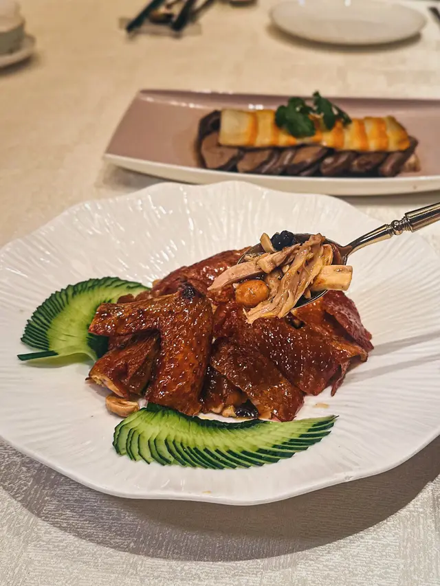雞皮脆到似玻璃,手撕雞肉和多款果仁撈埋一齊同食,口感好豐富。