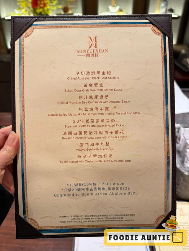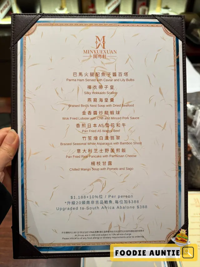 十斤黃金醬蘿蔔 HKD 168 椒香脆芥蘭芯 HKD 188 禪衣帶子皇 HKD 336 荔浦黃金匣 HKD 288 大紅袍乳鴿 HKD 198 黑虎掌紅燒豆腐 HKD 268 鮑魚球肉絲炒麵 HKD 196 荔枝石榴露 HKD 156