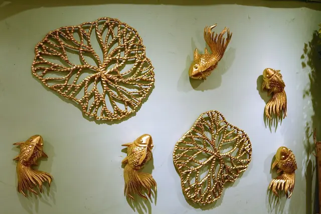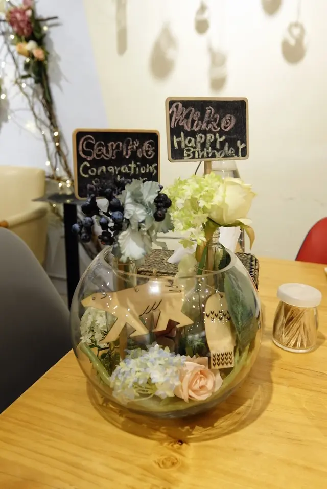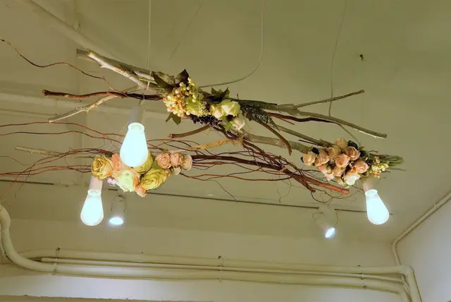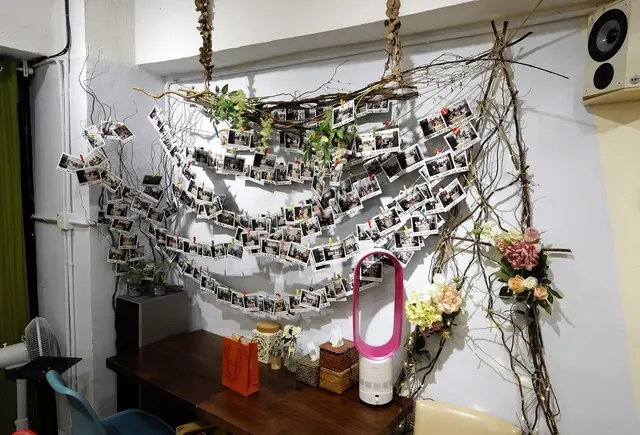 牆上也有不少別出心裁的裝飾,金漆木製的金魚池塘裝飾,用竹架麻線吊著的玻璃球型盆栽,還有用樹枝絲花DIY而成的線架,令整個場地感覺很有田園氣息;最令Step感覺特別的就是有2個自制DIY線架,上面夾了一張張即影即有的相片,而且數量非常多,比上一年來的時多了差不多一倍;