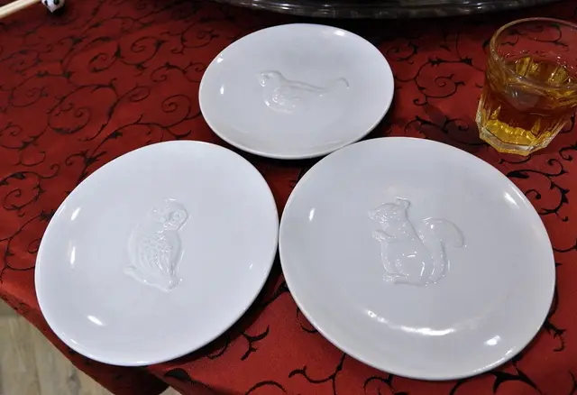 而每一個用來用膳盛裝食物的瓦碟,上面也有不同小動物的立體圖案,例如小鳥、松鼠、貓頭鷹等,真的既美觀又令人賞心悦目;而用來放醬油的小碟是一個茶壺形狀,在食具器皿上實在是很有心思呢!!