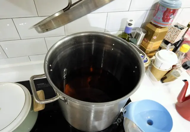 Waiter向我們解釋他們並不會奉上熱茶或是清水,反而是免費供應這個桑葉南北杏紅蘿蔔雪梨茶;他們在每段時間都會有不同的飲料提供,而這段時間就提供這個桑葉南北杏紅蘿蔔雪梨茶;Waiter帶Step到中間的開放式廚房看看這一大煲茶,可以看到茶色較深濃郁,不難想像這個茶是真材實料的煲熬出來,並不是加水來瞞天過海。
