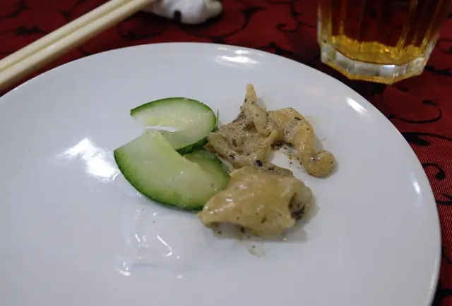 接著Waiter就上了第一道菜,名為冰鎮花膠;顧名思義,就是一個口感清涼爽口的餐前小食;碟中除了有花膠之外,還有份量非常多的青瓜片供客人連同花膠一起食用…但以Step的目測,這樣一起上碟的感覺令花膠的份量比例上少得有點無奈呢?!