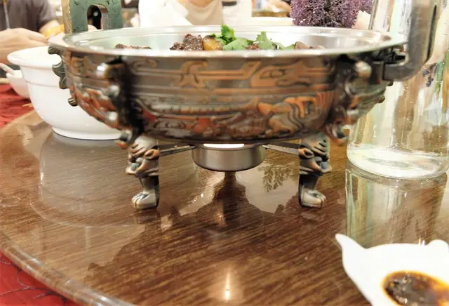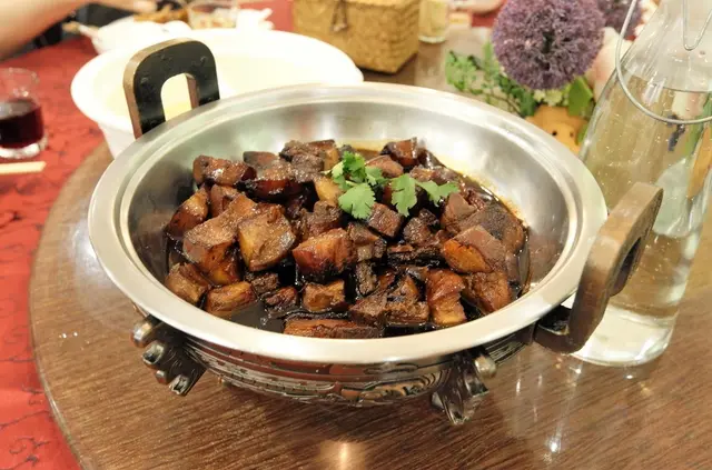隨著品嚐完這味胡椒蝦,Waiter也送上了一道家常小菜 – 昌媽媽炆豬肉… 這個昌媽媽炆豬肉用上了一個很精緻的器皿盛載,而且還有明火熱力放在盤底令菜餚保持一定的熱力來享用!!