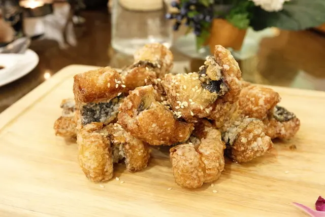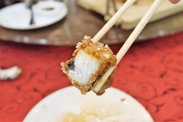 Waiter向我們解釋時說,這個鱔是大廚在附近觀塘街市的相熟攤檔中訂購回來,不是即買即有的,為何要訂購這麼麻煩呢?原因平時用來烹調的鱔,通常多骨,而肉質也是較為軟稔,用來炸的話口感只會是糊糊的做不到爽脆效果;而經過大廚的Try & Error後,來自台灣的台灣鱔才能符合大廚的要求,但因為價錢稍貴數量不多,所以需要特別訂購;台灣鱔的肉身較厚,而且少骨易入口,用來酥炸的話口感不但爽脆,而且吃起來可以說是啖啖肉,這樣食客就可以大大啖烹用而不怕俾骨刺傷喉嚨。