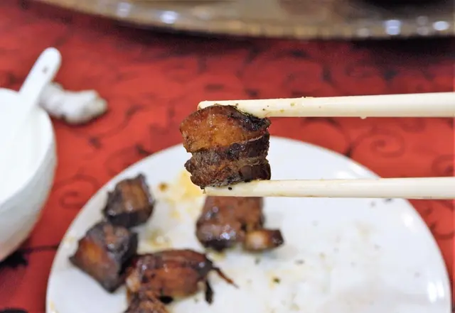 Step夾了數塊豬肉,豬肉每一件皆被略帶甜酸味道的調味汁(像是糖醋的味道)所醃製烹調而成,顏色變得啡黑色;另外每一件豬肉皆是五花腩,可以輕鬆地數到5層脂肪與豬肉,實是邪惡無比;入口時,豬肉味道肉香香濃撲鼻,加上配酸汁的加持,令進食時分外醒胃;
