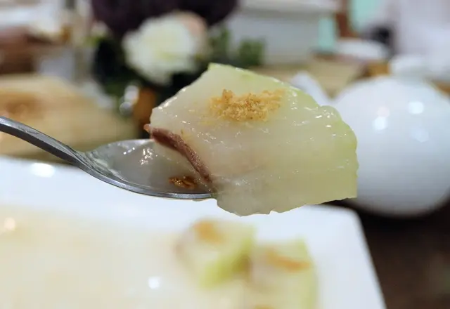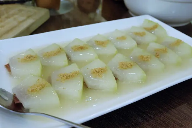 最後送來的就是葉婆婆冬瓜,將一片薄薄的金華火腿,用兩片冬瓜好似三文治般夾著蒸煮;蒸好後再在冬瓜的表面加上一點蝦乾碎來調味,令整體的口感和味道有著不一樣的感覺…