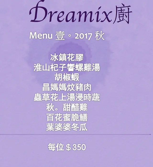 Dreamix廚並不是以一圍檯來計算,而是用每位人頭計算;這個『Menu壹。2017秋』盛為每位HKD350,最低消費多少Step反而沒有問呢…(4至11歲或65歲人士可獲半價優惠呢!!)