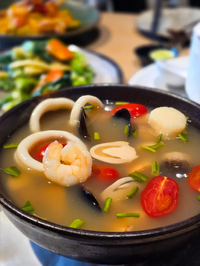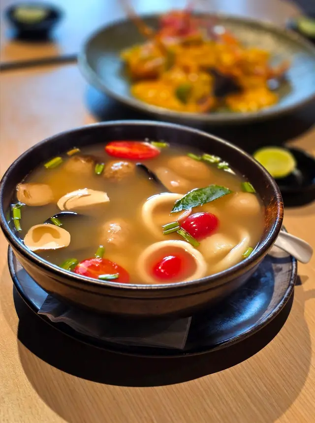 (沒有椰汁和紅咖喱膏)、多種辛香材匯合海鮮的鮮甜!不得不讚非常豐富與鮮度十足的海鮮用料,鮮蝦、帶子、青口和魷魚等,邊喝邊吃,叫人十分滿足!喜歡的話,可加入青檸汁提鮮。