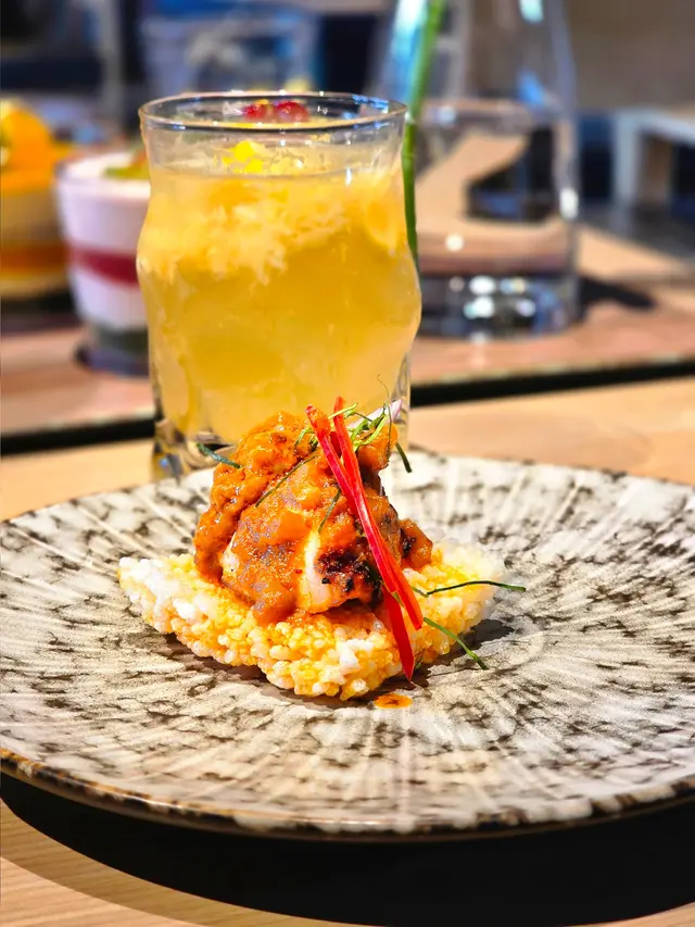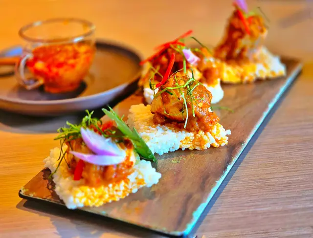 第一道三文魚脆米飯配香辣魚茸醬 HK$158 (潑水節菜式)擁有豐富的 Omega 3 ,搭配脆米和甜香的沙爹醬汁,既軟香又惹味,老少鹹宜。最滋味吃法是先將三文魚壓扁,然後淋上大量醬汁,當醬汁滲滿三文魚和脆米,便是最豐味的時候!