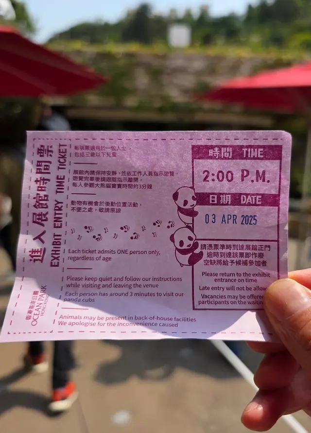 出發前,查看了幾篇網上攻略,然後綜合今次自身經驗,不妨長氣呼籲大家盡早入園,並第一時間索取進入展館時間票,否則有可能會錯過與可愛活潑的「家姐」、「細佬」和媽爸的 「盈盈」、「樂樂」的會面機會! 事關當日約早上11時取票,拿到的是下午兩點。隨後11時半左右,發現進入展館時間票已全滿,排隊後補入館的人龍不斷。所以先拿到進入展館時間票,然後才安排其他遊園行程會較穩妥。當日陽光明媚、不冷也不太熱的好天氣下,公園不乏中外遊客、幼稚園參觀團,與愛犬同遊的香港市民,也有繪畫比賽的老師和學生,非常熱鬧 。走過「香港老大街」同幾個景點後,看到樹懶「小迅」和「英木」眯著眼睛被餵食,肚子徐徐響起鼓聲,決定先來個午飯。