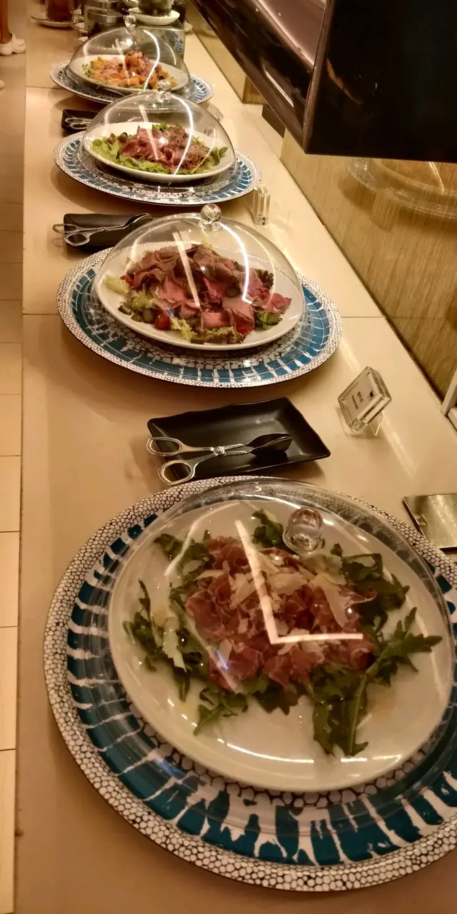 前菜選擇超逾十款,除基本西式生菜、粟米紅豆、千島醬外,還有特別中式涼菜口水雞、醋香雲耳,開胃提神。意式風乾火腿也有四款,雲石脂肪紋理,配上哈密瓜果肉,入口肉質軟綿,味蕾甜中雜有咸香。只吃前菜,已飽了一大半。