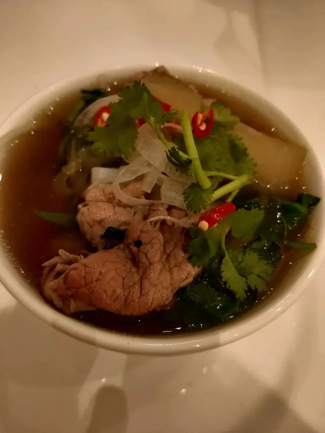 熱暈選擇不多,也不太吸引。或許只是個人觀感,做餐飲行業日久,看一眼食物已知其味。除非創新食物,否則胃口不大。只選擇了一碗越式生牛肉湯河,配有蘿蔔生肥牛肉洋蔥。