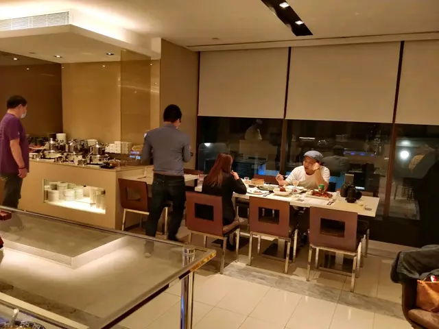 被安排入座時,酒店傳訊部員工剛來向兩男握手派發卡片。兩男檯上放有大型相機再加幾支昂貴鏡頭,很快地大廚發號施令為兩男起菜,食物琳瑯滿目目不暇給,整盤日式刺身、原隻燒雞、蒸籠開邊大蝦、串燒、甜品等等。美妙非常,食物精心擺設伴碟裝飾,質素甚高。