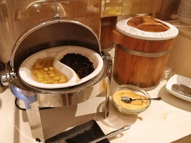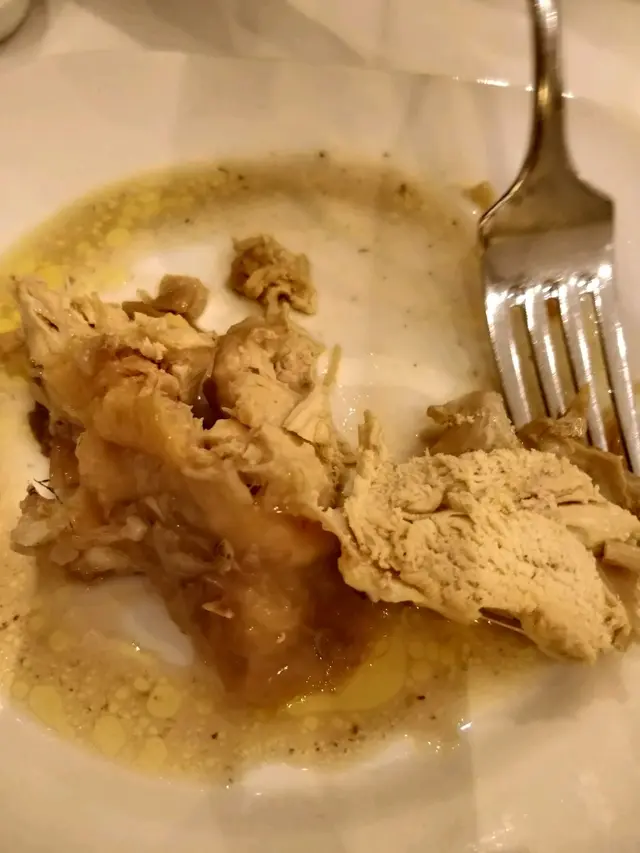 中低檔次的酒店自助餐廳都喜歡搞氣氛,大概時間為客人吃至半飽,正當沉悶之際就會大鑼大鼓,推出特別食品製造高潮。這兒也好此道,推出「富貴雞」。首輪沒去排隊,服務員第二輪再三邀請就前去看看情況,取回雞肉一塊,毫無賣相可言,肉質粗糙。什麼叫「富貴雞」?原來在雞肚內釀入瑤柱海味,然後入爐蒸透,讓瑤柱香味溶入雞肉內。可惜,烹調過久,浪費食材。