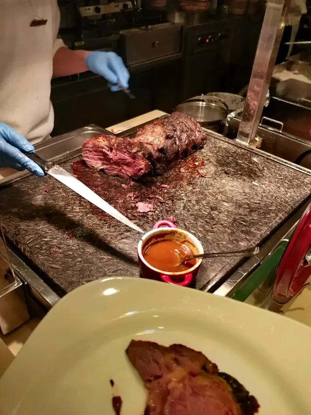 肉眼扒是基本自助餐菜式,只有一款選擇。肉質燒得準確,介乎七成熟,廚師用力壓下時微微滲出血水。割了一大片,加點照燒汁醬,皮外黑椒粒帶出咸味,肉質鮮嫩。