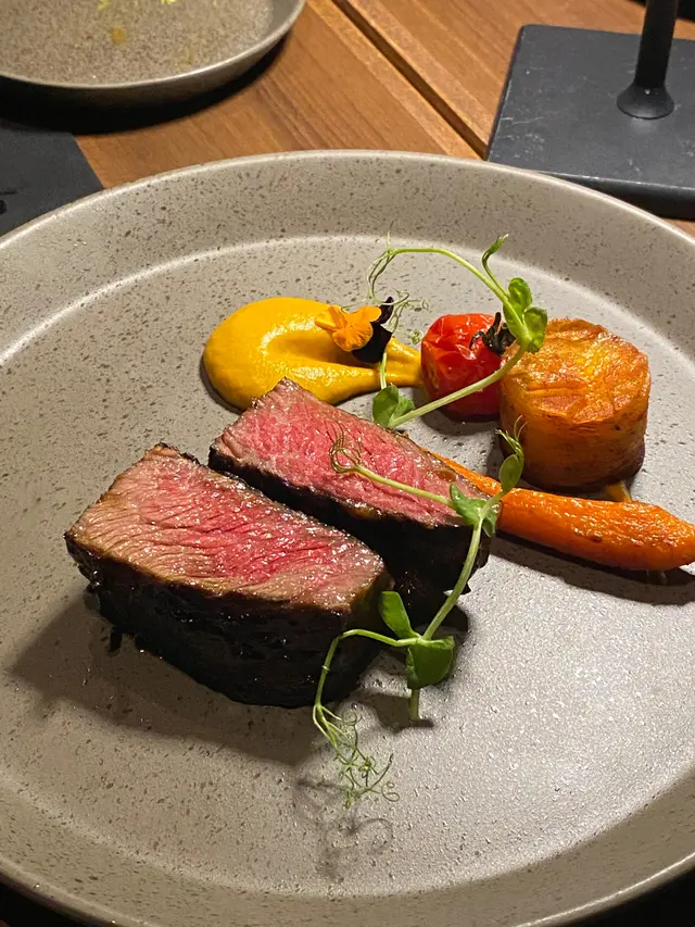 則是這次用餐的亮點之一。炭烤的M7和牛短肋肉質粉紅軟嫩,搭配胡蘿蔔泥和油封馬鈴薯,再加上波特酒醬汁,味道濃郁而不膩。