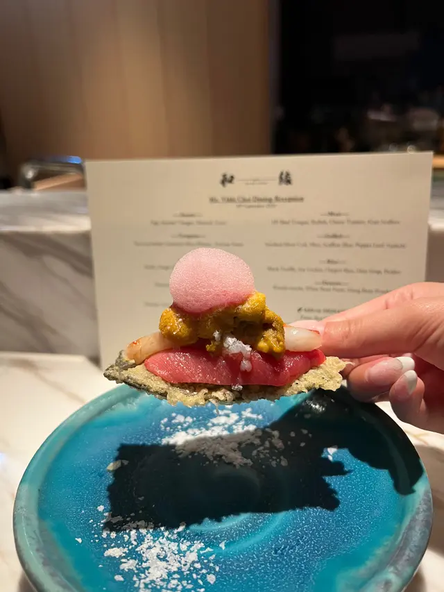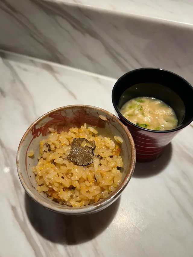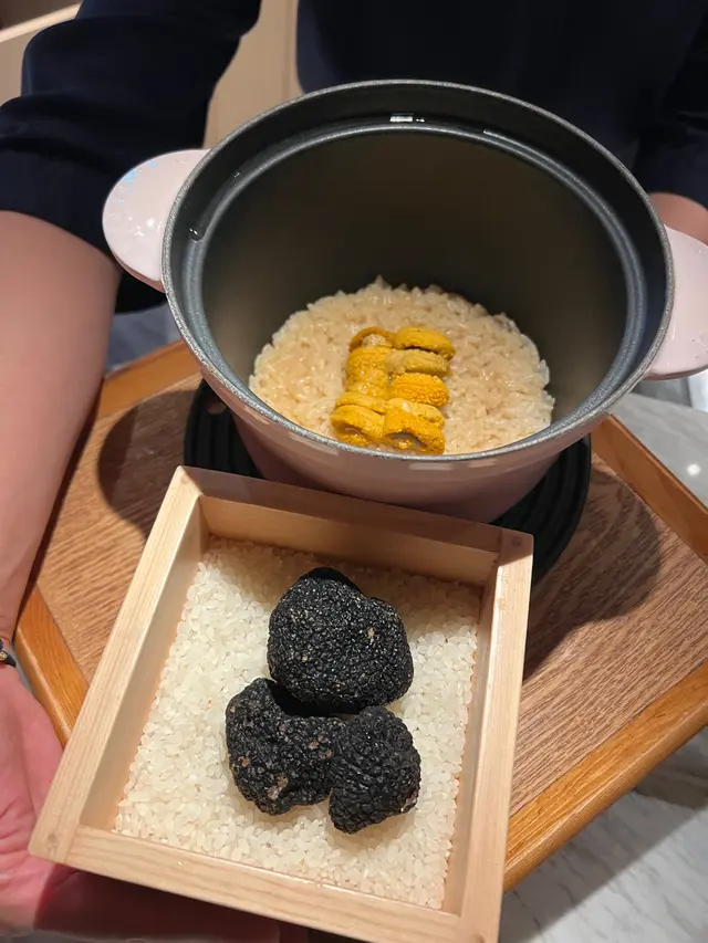 海胆铺在米饭上再加上黑松露薄片,海胆搅拌后与米饭完美融合,吃在嘴里超级鲜美。
