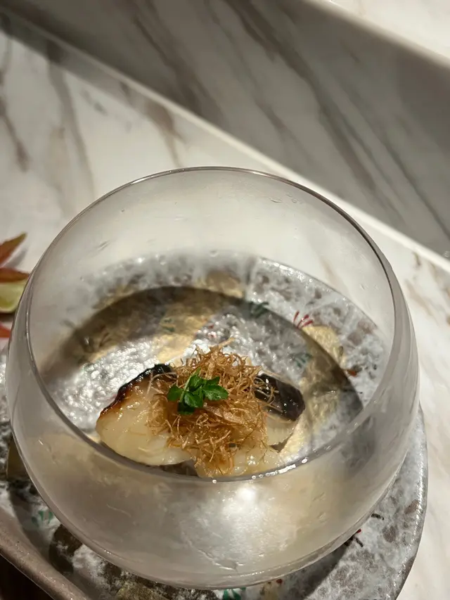 烧物-银鳕鱼是用苹果木和酒粕进行烟熏,搭配香口的白发葱,可以品尝到银鳕鱼嫩滑鱼肉还有浓浓的烟熏味道。