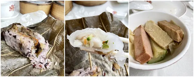 珍珠雞用紫米&長方形幾有趣,上面有些榨菜之類(?),不過吃起來沒甚麼味道,大概只有飯味。蝦餃中規中距,上檯時沒有附豉油我又懶得問,點豉油應該好食啲。素雞扎入面有翠玉瓜、素火腿和兩舊不同形狀的素雞,蠻搞笑。