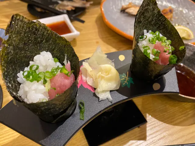 手卷包得非常好,吞拿魚蓉滑腻,碎蔥嘅香味增添咗層次感