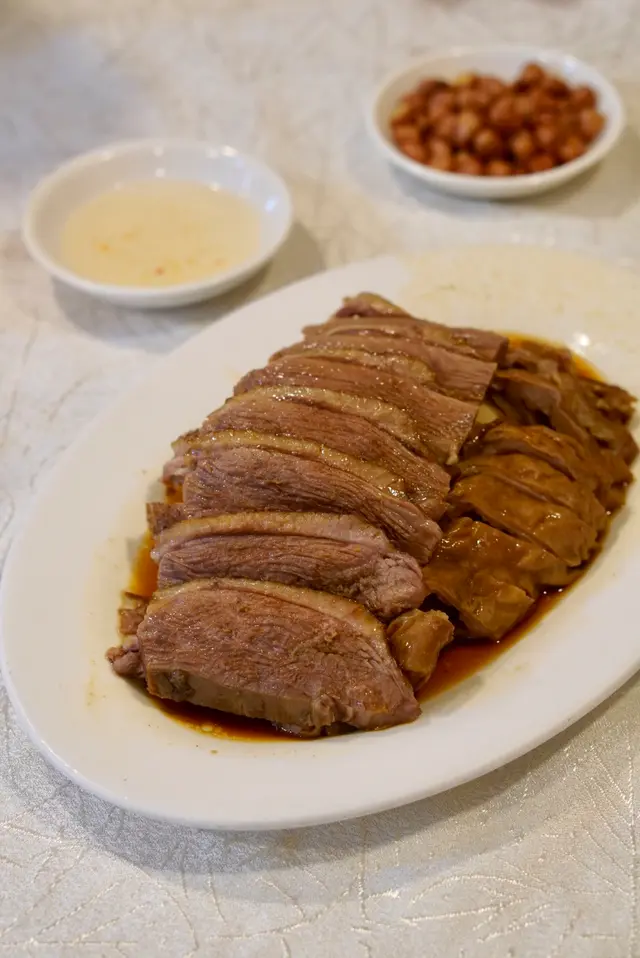 【卤水拼盘】这天没有鹅肝,但我们选的鹅肉/豆腐/大肠拼盘也是极好的。大片大片的鹅肉透着润泽的光,吃起来紧致有嚼劲,均匀的纹理中渗透出咸香的卤汁,深邃的卤香与鹅肉滋淳的肉香浑然一体。