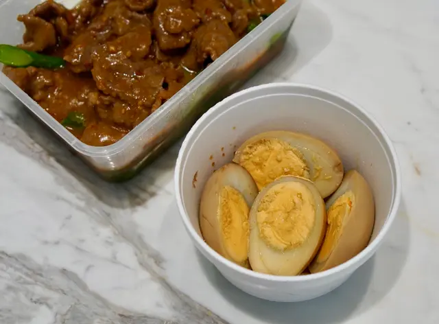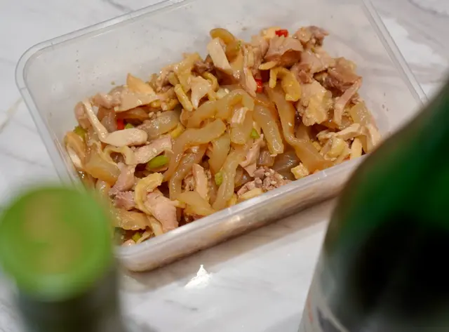 【海蜇手撕鸡】接下来几道都是外卖回去的下酒菜。海蜇和鸡肉品质都不错,但调味比较清淡,用的应该是葱油,感觉还是川式的手撕鸡吃着更爽。