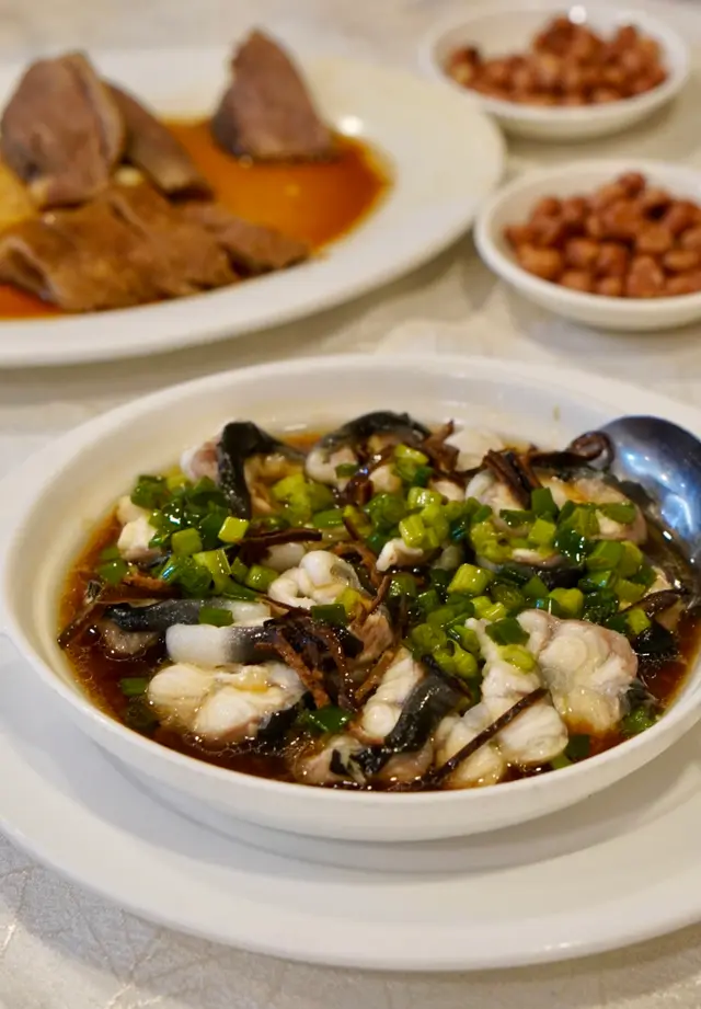 【果皮蒸白鳝】陈皮版本的蟠龙鳝,整体味美清淡,鳝肉不老,外层韧,内里柔软,细腻无腥,不过刀工可以更讲究点。火候也正好,汤汁中裹挟着鲜嫩的鱼胶,形成了一道微浓的自来芡。