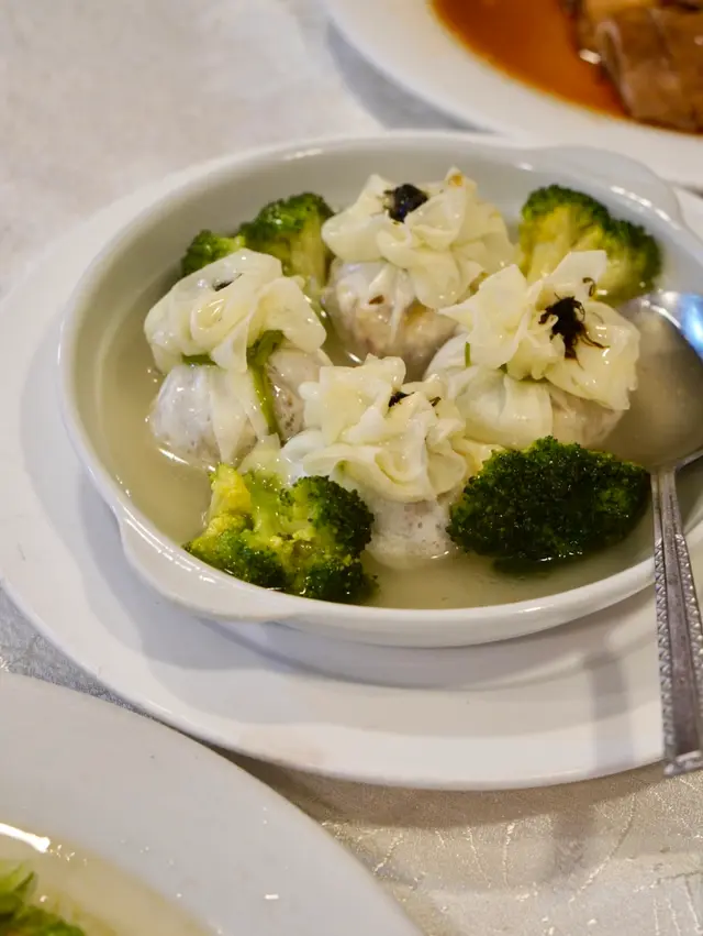 【菊花石榴鸡】出于对名字的好奇浅尝了一下,也是清淡味型,但高汤是提鲜神器。软润的蛋皮捆扎成类似烧卖的形状,拖住沉甸甸的鸡肉糜。鸡肉细腻,混合了香菇颗粒好像还有笋丁,口感也挺有趣。