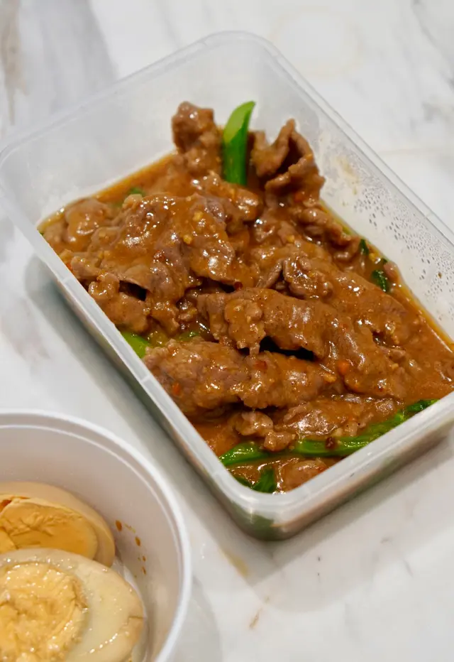 【沙茶牛肉】其实是沙茶牛肉芥兰,芥兰新鲜脆口,但刀工依然是比较随意,大小粗细不够工整。牛肉腌得不错,大片弹嫩咸香,沙茶酱给得慷慨,能明显感觉到花生的醇厚。但越吃越稀,最后成了汤汤水水的质地,这道菜我更喜欢新忠记的版本。