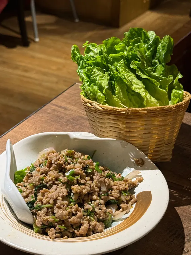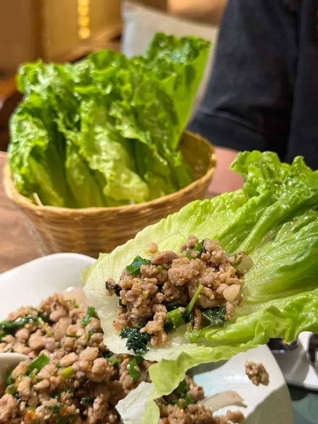 最後仲有我哋都好鍾意嘅肉碎生菜包 🥬🐷肉碎主要用豬肉,炒得非常乾身,而且調味做得好出色 🌟。佢加入咗香茅、少許辣椒同青檸汁去調味,肉碎鹹香得嚟帶有微酸同微辣,味道好立體。食完一輪重口味嘅嘢之後,食呢個就最啱!💯