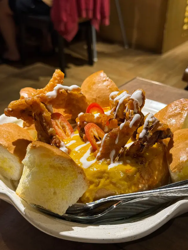 跟住上枱嘅係咖喱軟殼蟹農夫包 🦀,賣相非常澎湃,係打卡之選!📸 個大農夫包烘到外皮金黃酥脆 🥖,中間嘅咖喱汁味道好香濃,椰奶嘅甜味同泰式香料嘅辣味配合得天衣無縫 🥥🌶️。佢嘅辣度屬於大眾化嘅小辣,食落好開胃。軟殼蟹炸得幾脆口,而且超級大份,有6-7舊,每一份都好大舊🤏浸咗咖喱汁之後都好夠味,係一個好邪惡但又令人滿足嘅組合!😋