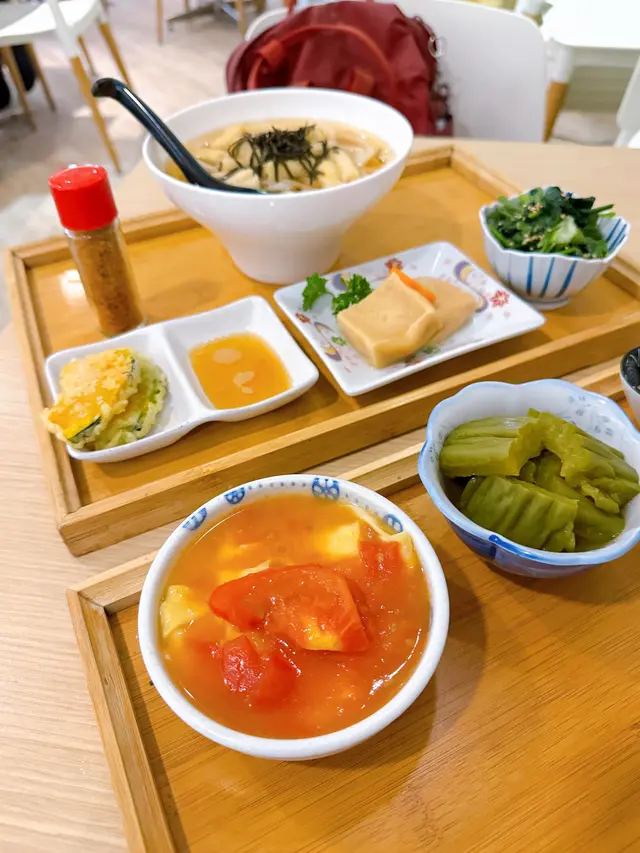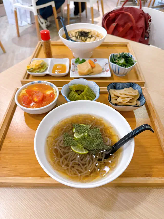 前菜選了番茄鮮腐皮、苦瓜煮、炒蓮根,三款皆以清爽見稱,尤其番茄鮮腐皮酸甜開胃,味道平衡得恰到好處。主食加$10轉為蒟蒻麵,口感彈牙且低卡路里,青檸冷湯底清新微酸,非常適合夏日享用😋