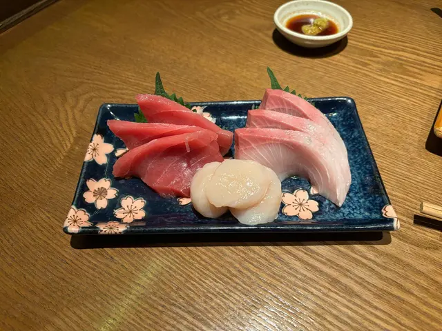 每日新鮮空運到港. 厚厚嘅吞拿魚同油甘魚魚生片油脂飽滿又新鮮,仲有大大粒鮮甜嘅帶子,每樣三件,高質. 另外仲有兩點或者四點可供選擇,豐儉由人.