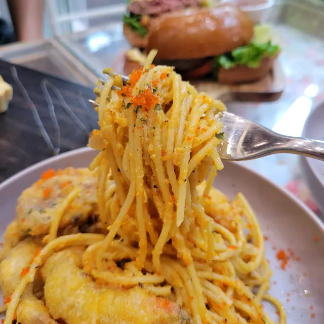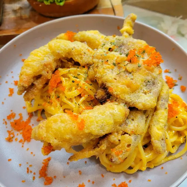 驚喜之選‼️每條意粉都好均勻地俾咸蛋黃包圍,仲有滿滿蟹肉同蟹籽😻所以口感同味道都好好👍🏻 軟殼蟹夠大隻啖啖肉,炸得夠脆口,唔會厚漿/成口油🫶🏻推薦大家一試啊👻