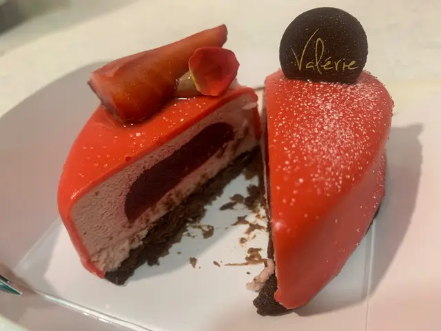 切開是草莓慕絲配合紅莓夾心,底層是可可軟曲奇,帶微脆口感