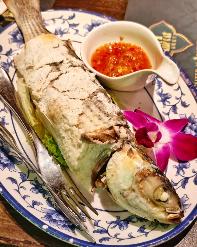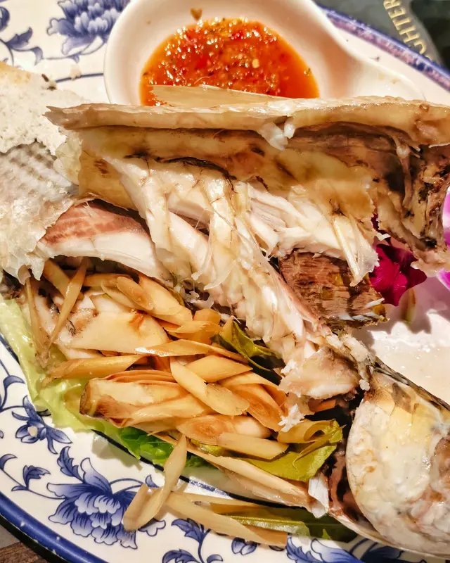 主菜香茅鹽燒烏頭🐟,原條鹽燒分量十足,經香茅🌿同海鹽簡單調味後烤焗,魚肉鮮甜多汁又嫩滑😋,魚肚入邊仲塞滿香茅,風味十足👏。