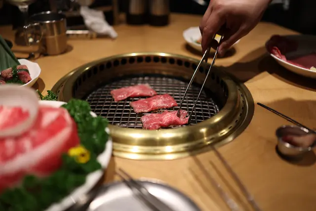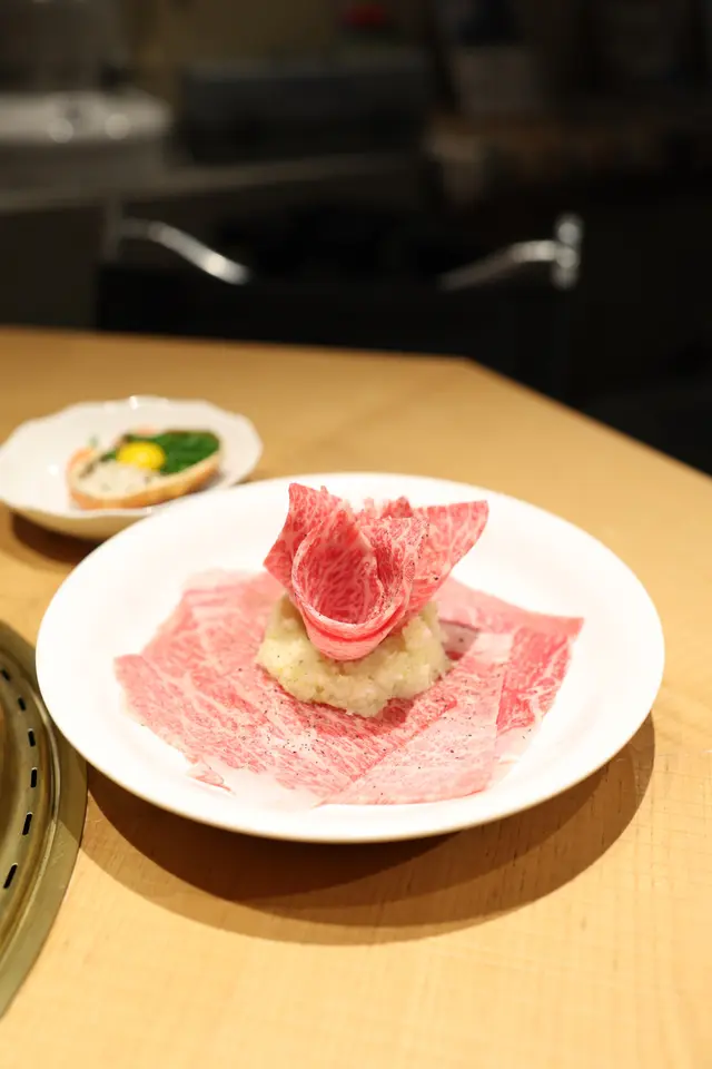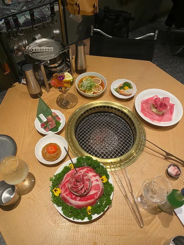 1. 視覺擔當:燒肉蛋糕 & A5和王牛 🥩 套餐最吸睛一定係「燒肉蛋糕」,用肉片堆砌成蛋糕形狀,打卡必備。而「A5和王牛三角腹肉」更加係驚喜,雪花紋理分佈均勻,燒輕輕幾秒入口,油脂喺口入面爆發,完全唔會有筋,非常軟嫩。