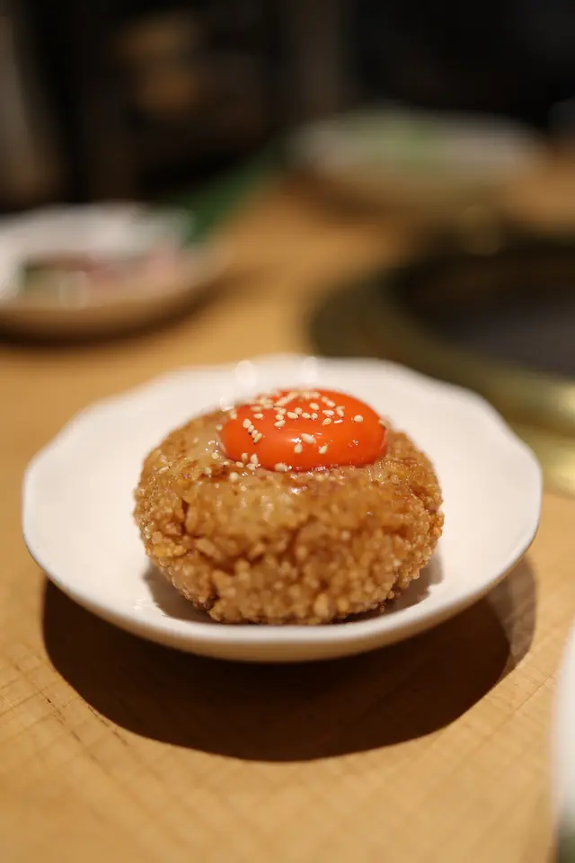 3. 澱粉質驚喜:月見夢王蛋醬燒飯團 🍙 平時食燒肉好怕食飯,但呢個飯團值得留肚。表面燒到焦脆,類似鍋巴嘅口感,點埋日本夢王蛋嘅蛋黃汁,蛋香令飯團昇華咗不少。