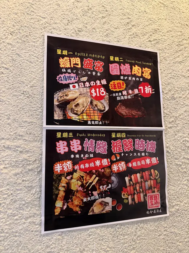 💡 星期一至四清酒紅酒啤酒任飲一小時$108 兩小時$198,仲有唔同優惠!
